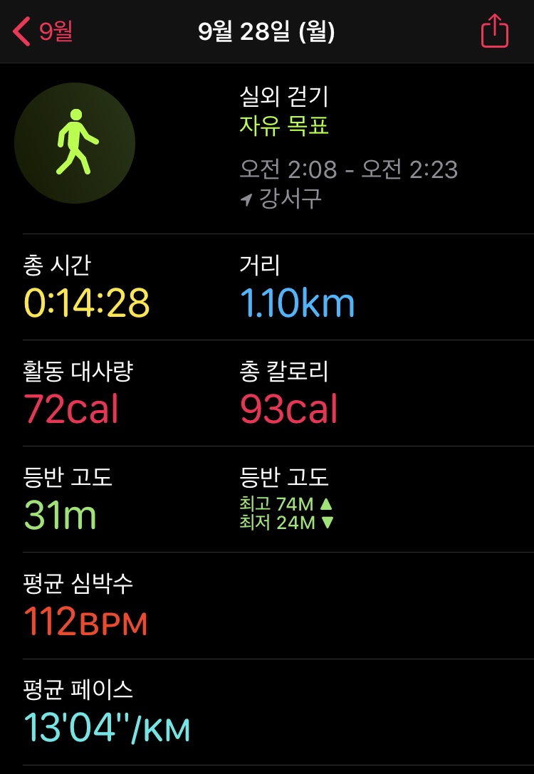 시간도 20분이다. 기록도 나쁘지 않고 평균 심박수도 괜찮다.!