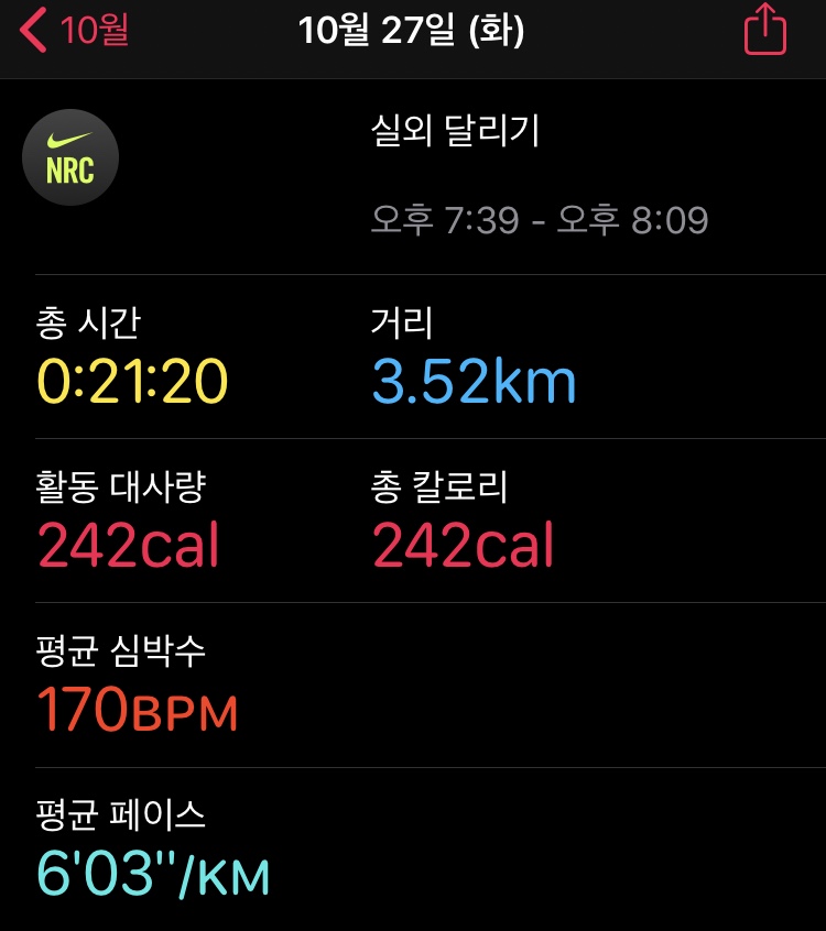 | [러닝로그] 오랜만에 3.5km 새벽러닝 (2) | 2020.10.30 |
